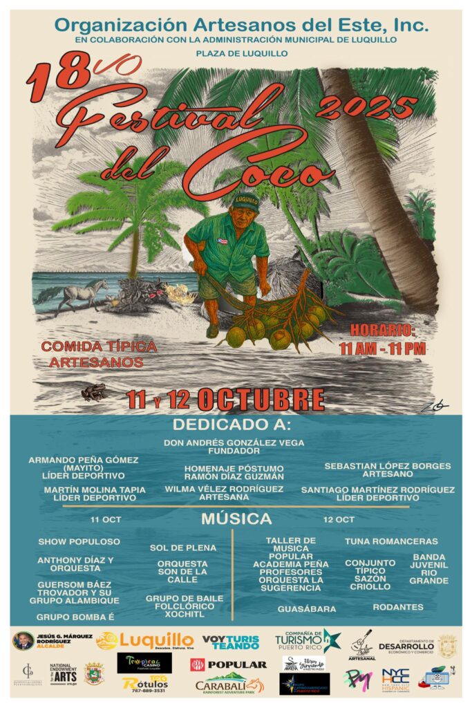 Para conmemorar la efeméride del descubrimiento de América, este sábado 11 al domingo 12 de octubre, regresa el Festival del Coco a la Plaza Pública de Luquillo con una cartelera artística, gastronómica y de exhibición artesanal que convierte el evento en una verdadera fiesta cultural. El evento, este año en su decimoctava edición será dedicado […]