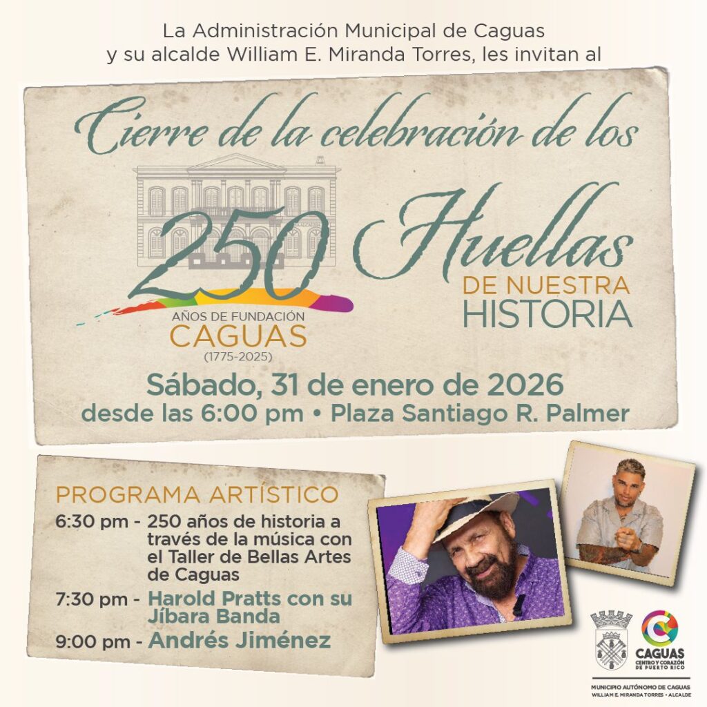 Como parte del cierre oficial de la conmemoración de los 250 años de la fundación de Caguas, el próximo 31 de enero a las 6:00 p.m. en la Plaza Palmer de Caguas se llevará a cabo un eventoartístico que reunirá a la comunidad en una celebración cultural sin precedentes. Así lo anunció el alcalde de […]
