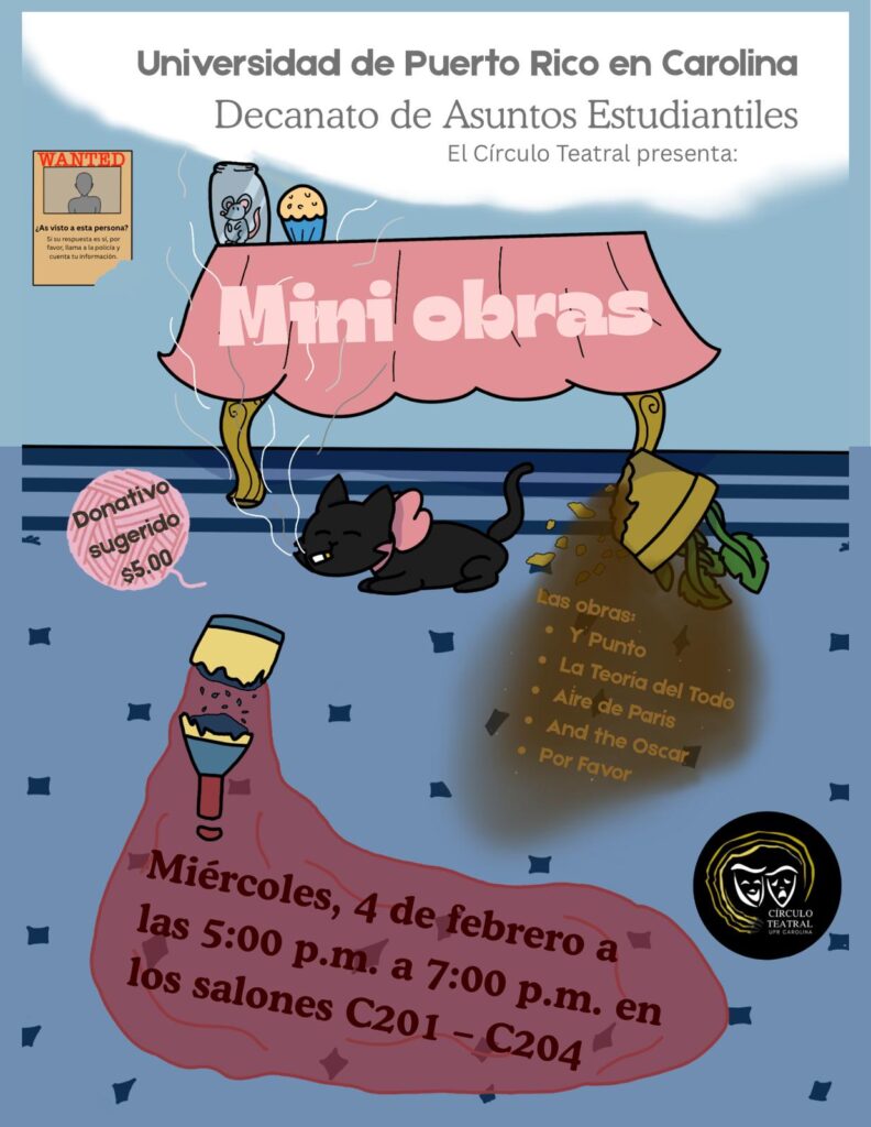 El Decanato de Asuntos Estudiantiles de la Universidad de Puerto Rico en Carolina invita a la comunidad universitaria y al público general a disfrutar de una velada teatral única el miércoles, 4 de febrero de 2026, de 5:00 p.m. a 7:00 p.m. en los salones C201 – C204. El evento, organizado por El Círculo Teatral, […]