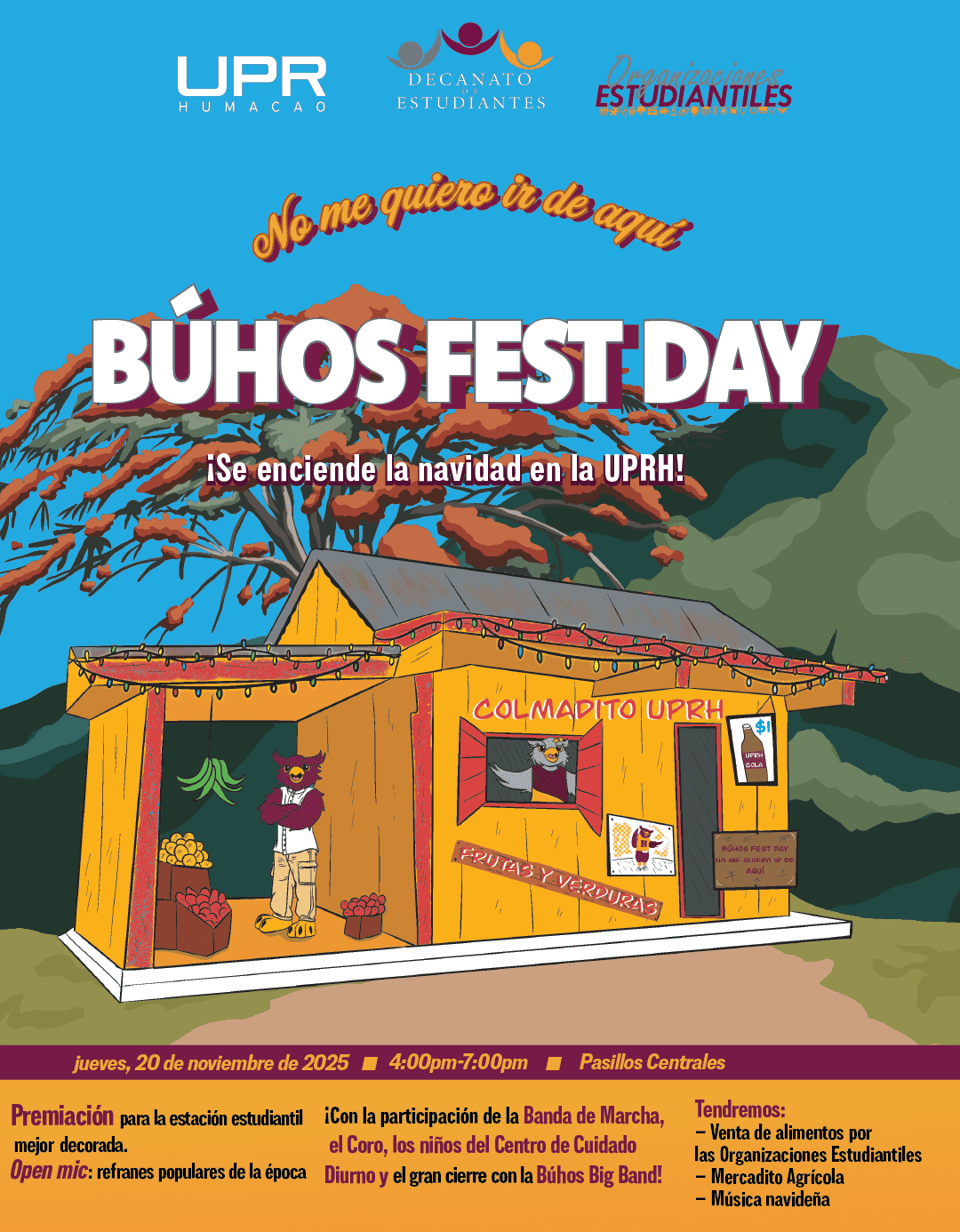 La Universidad de Puerto Rico en Humacao (UPRH) invita a la comunidad universitaria y al público general a disfrutar del evento ¡No me quiero ir de aquí! – Búhos Fest Day, una celebración especial que marcará el inicio oficial de la temporada navideña en el campus. La actividad se llevará a cabo el jueves, 20 de noviembre de 2025, desde las 4:00 p.m., en los pasillos centrales de la institución.